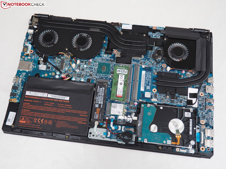Not sure yours what model. Mine Prime 15, opened up, near the top (near display hinge), it's all heat sink and fans + motherboard below only. Battery is just next to HDD below the keyboard area, the whole stretch from the left to the right of touchpad.