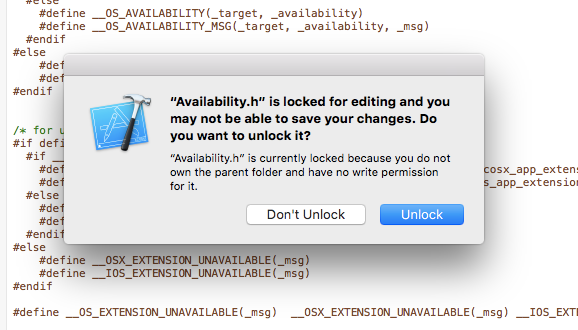 So i tried editing the Availability.h in Xcode. Seems like my problem is file permission, which i already enabled to "Read & Write". Can somebody help me?