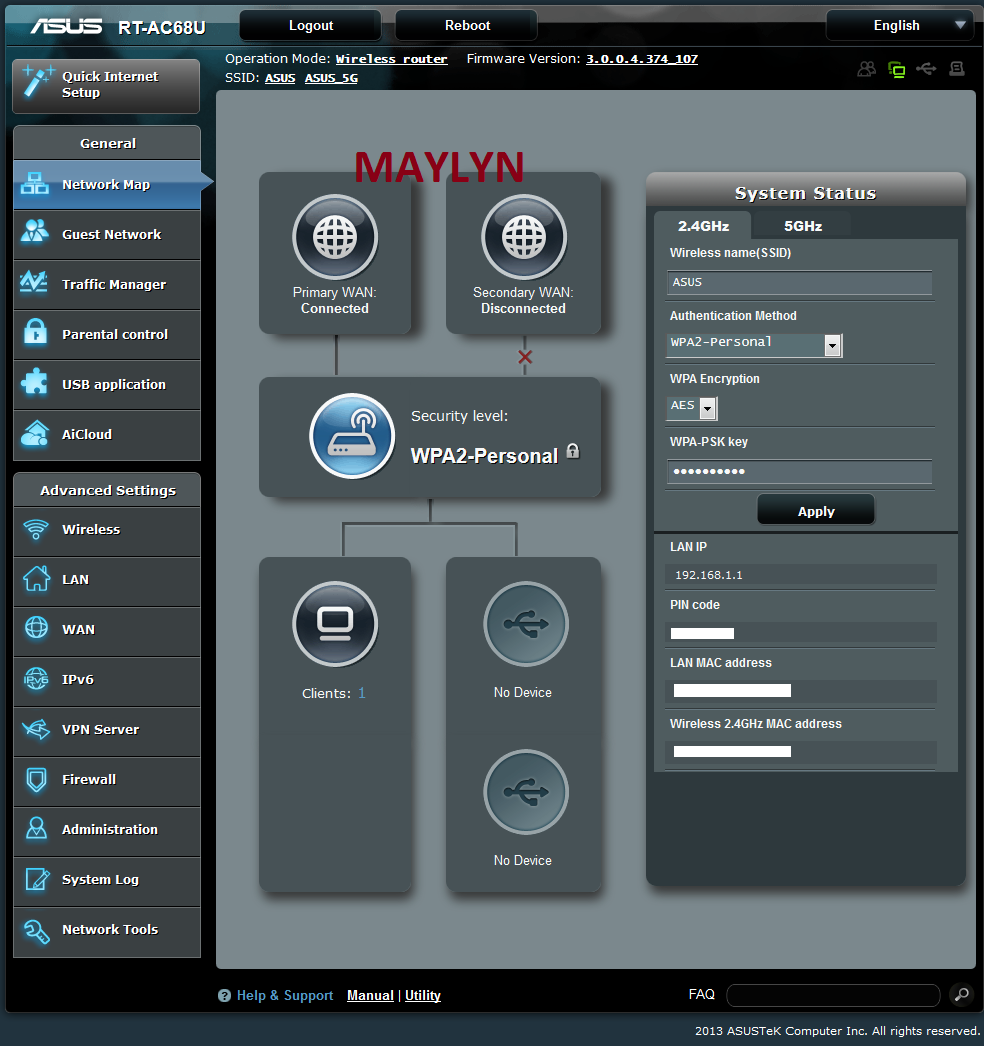 maylyn Master Member Joined Jul 12, 2007 Messages 4,861 Reaction score 77 Sep 4, 2013 #2 Default UI It's on dual WAN at default settings with fail over on USB port, hardware revision ~ A1 and stock firmware ~ 3.0.0.4.374.107 Last edited: Sep 6, 2013